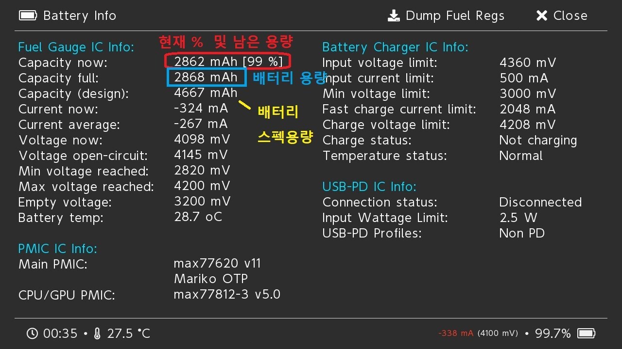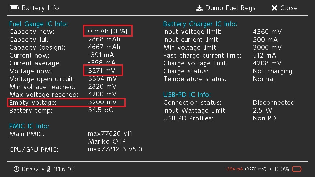 Voltage now : 3.271V ◀ 3.2V로 스위치 OS에서 방전할수 있는 최대 값까지 정상 방전된 것을 알수 있습니다.